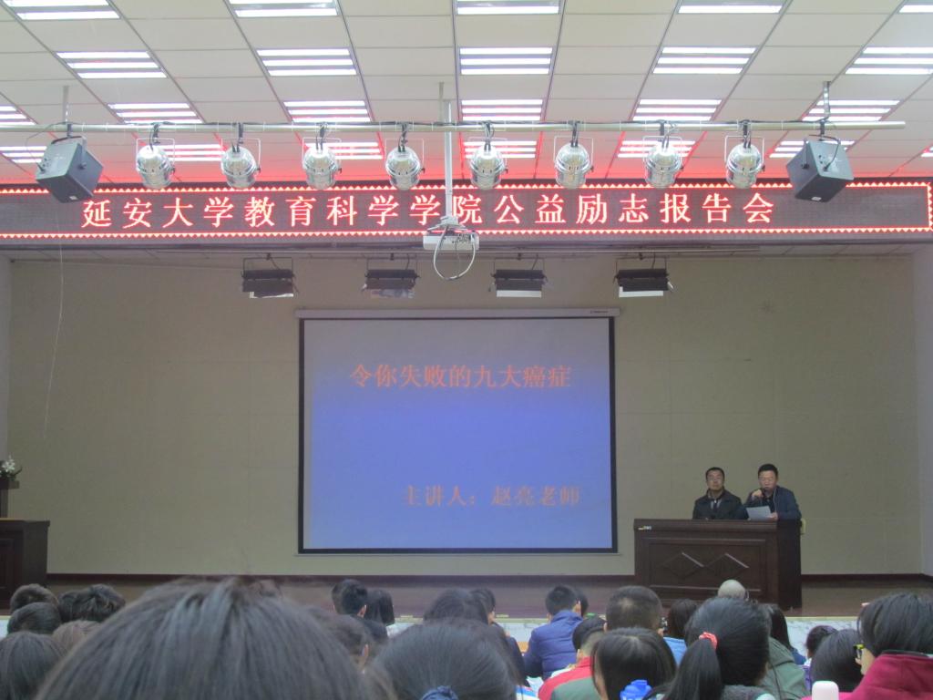 4月1日晚,我院邀请校友“点亮激情,照亮人生”的导师赵亮在外语学院小礼堂为我院14级学生作题为《令你失败的九大癌症》的励志报告会,报告会由我院党委副书记杨文军主持。
